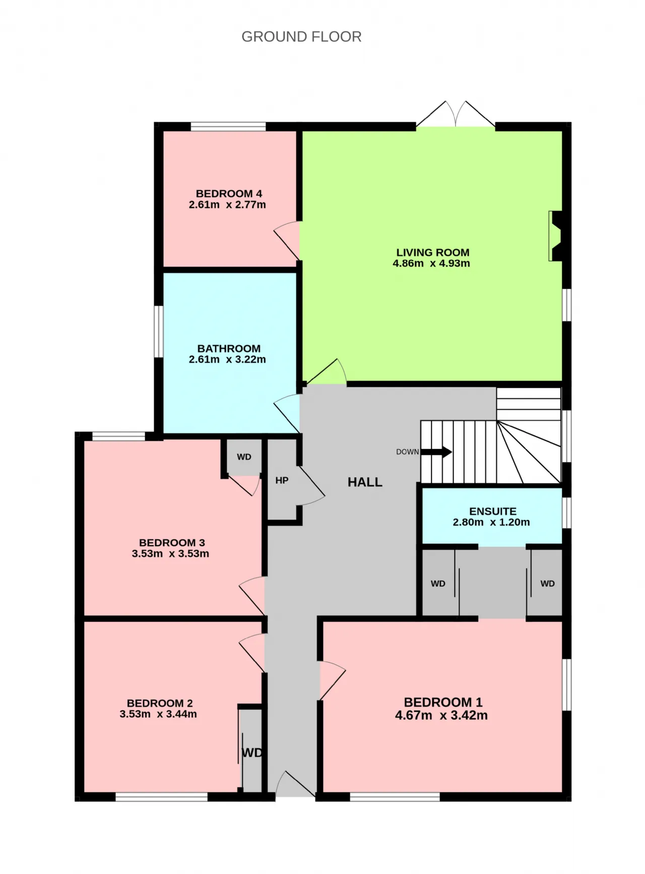 Bedroom 1 4.67m x 3.42m A large dual aspect bedroom at the front of the home with extensive built in wardrobes and shelving. Leading to: