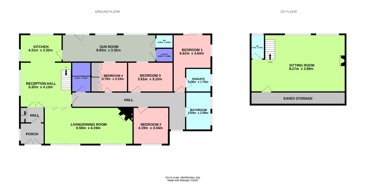 Upon entering, you are welcomed by an inviting entrance porch that leads into the dining hall. An opening then flows into the kitchen at the rear, which features a convenient breakfast bar—perfect for meals on the go. The main reception area, located at the front of the property, is generously sized and includes a wood-burning stove, adding a cozy and welcoming touch. This level also hosts four bedrooms, with the main bedroom boasting an en-suite and double doors that open to the expansive grounds. There is large sunroom located to the rear which accesses both the utility room and a guest wc. A family bathroom and separate sauna with its own separate step in shower completes the accommodations on this floor. Upstairs, you’ll find an exceptionally large space that offers versatile potential—whether as a home office, additional living area, or an extra bedroom. A guest WC upstairs provides added convenience.