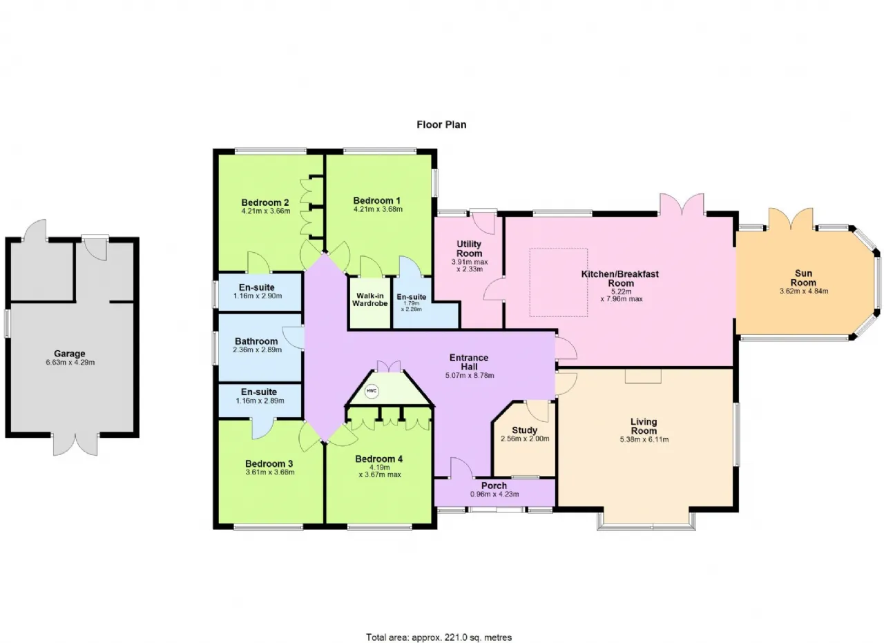 En-Suite 1 2.28m x 1.79m A spacious, fully tiled en-suite bathroom featuring an electric shower, wc and whb. Finished to a high standard, offering both comfort and convenience.