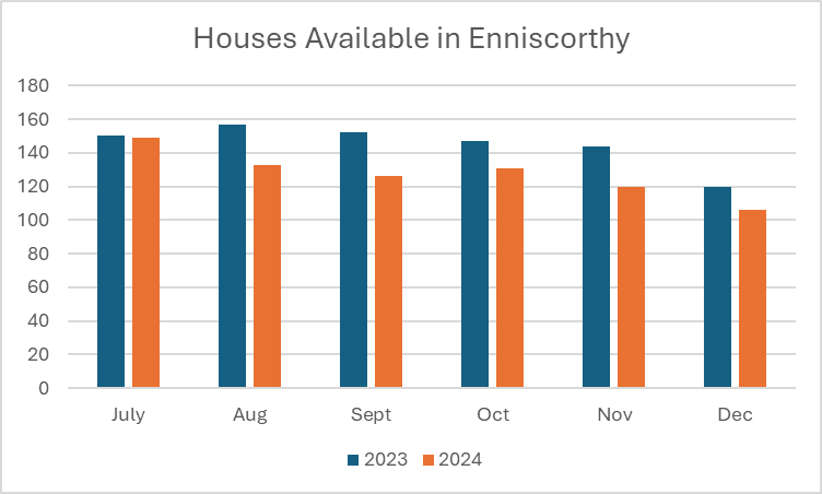 There has been a significant drop in the number of properties available for sale in Enniscorthy, with a decrease of 22% in available listings from the same period in 2023 (see above table). This reduction in supply has created a more competitive market, pushing prices higher and reducing options for potential buyers. As a result, many buyers are finding themselves in bidding wars or facing limited choices.