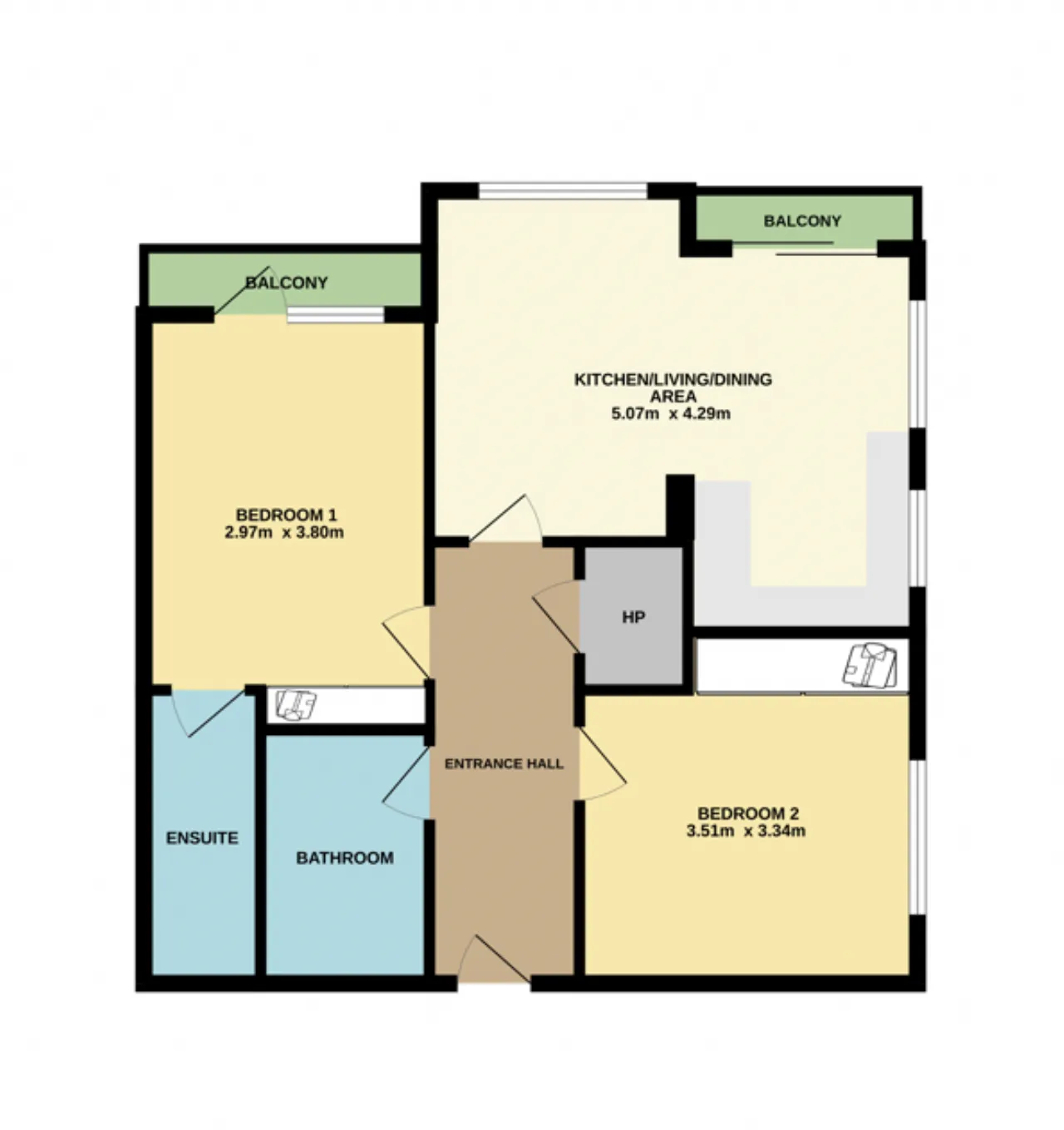 Kitchen/Living/Dining Area 5.07m x 4.29m A large dual aspect, open plan reception room, the kitchen is well-fitted with floor and eye-level units topped with a quartz countertop and a matching upstand, there is a selection of premium kitchen appliances including oven, hob, fridge freezer, dishwasher and washer dryer, this part of the room benefits from tiled flooring. The living/dining area is an open reception space with engineered wood flooring and a glass French door providing access to the balcony.