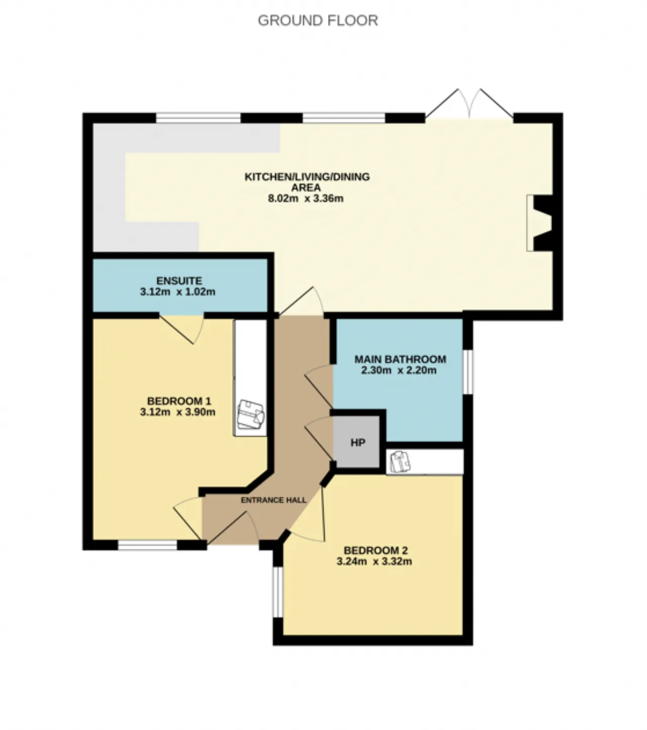 Kitchen/Living/Dining Area 8.02m x 3.36m The kitchen is well-fitted with floor and eye-level units, a selection of premium kitchen appliances including oven, hob, fridge freezer and dishwasher, there is a tiled splashback and laminate wood flooring. The living/dining area is an open plan reception space with door providing access to the courtyard.
