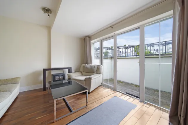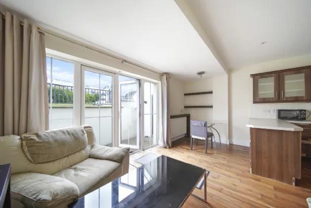 Kitchen/Dining/Living Area 5.4 x 5.2 Wooden floor throughout. Eye and low level units with stainless steel sink and tiled splash back. Built in electric oven with four ring hob and overhead extractor fan. Plumbed for washer/dryer. Under counter fridge freezer. Ample dining/living space with double door leading to paved area.