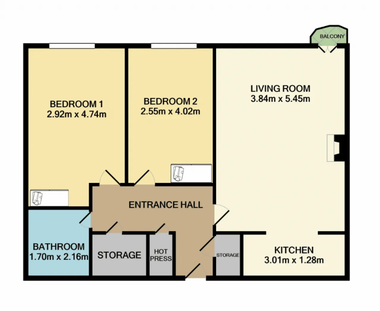 The accommodation briefly comprises: entrance hall, storage and hot press, family bathroom, two double bedrooms with built in wardrobes, spacious living / dining room and fitted kitchen. This would make an ideal purchase for first time buyers, working professionals and investors alike.