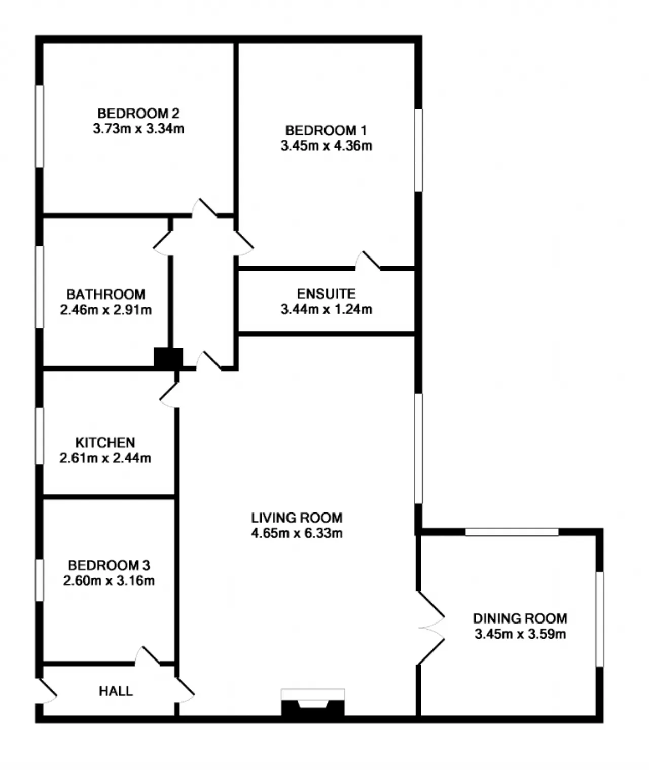 Dining Room 3.45m x 3.59m French double doors off the living room leading to dining room, dual aspect with large picture windows.