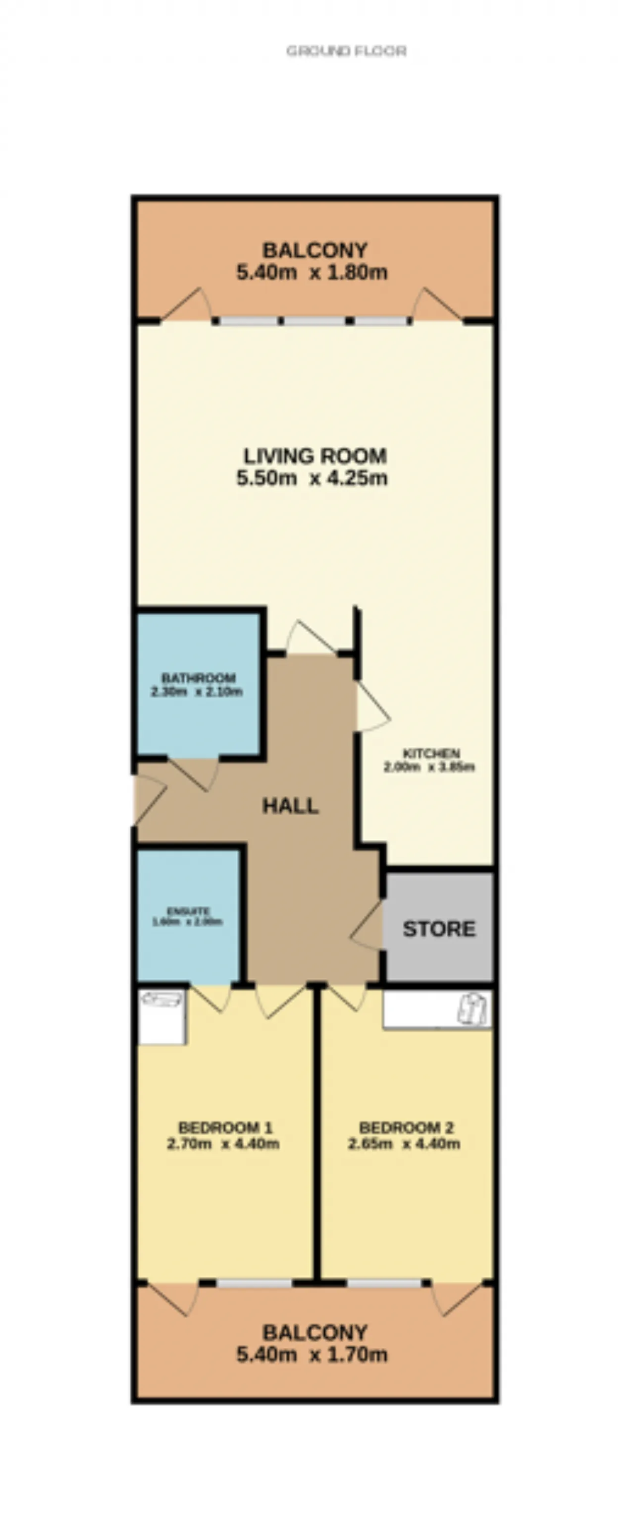 Bedroom 2 4.4m x 2.65m A second bright double bedroom which benefits from a full-length side window and a door providing access to the balcony. The room features a built-in wardrobe and finished with hardwood flooring.