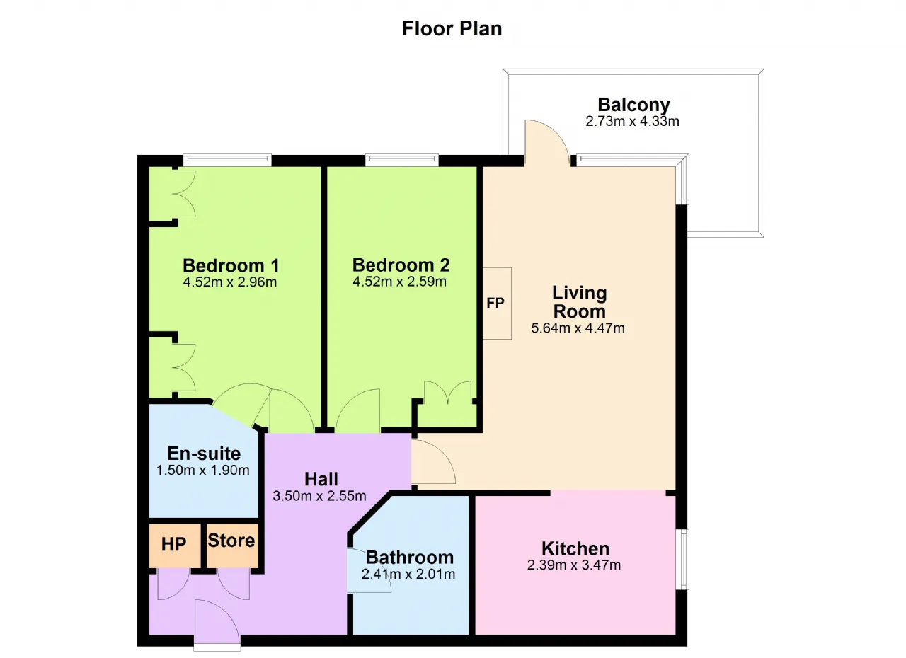 Bedroom 1 4.52m x 2.96m A large double bedroom with carpeted flooring, built-in wardrobe, and electric storage heater. Access to a private en-suite.