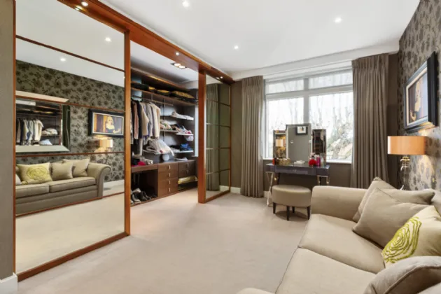 Walk-in Wardrobe: with bespoke wardrobes and recessed lights.