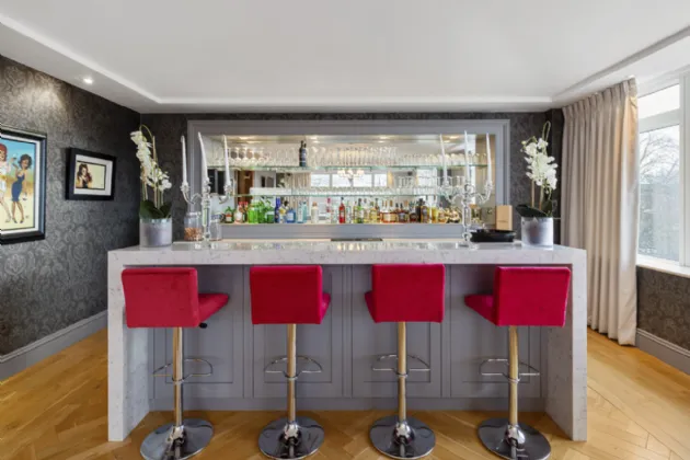 Drawing Room: beautiful bright reception room with wall to wall windows, sandstone fireplace with gas fire, oak floor, underfloor heating, recessed lights, bespoke alcove cupboard with mirrored wall and glass shelving and door to a private terrace. A lovely feature of the room is the bespoke bar area with fitted cabinets with a mirrored backing and glass shelving, two Fisher & Paykel fridges, ice machine and marble work surfaces.