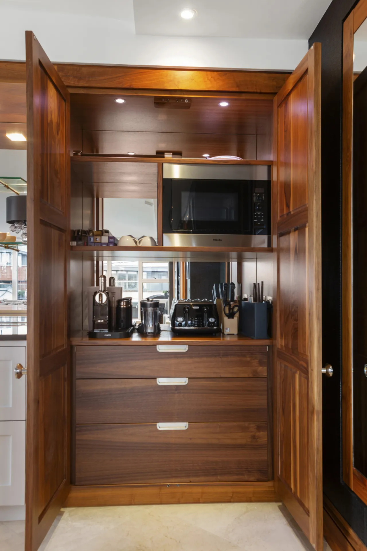 Kitchen / Dining / Living Room: a lovely bright open plan space facing south and west with stunning kitchen cabinets, mirrored pantry cupboard, four Fisher & Paykel integrated pull out drawer fridges, Miele integrated dishwasher, Neff four ring induction hob, automatic rising extractor fan, Miele oversized oven, hot water tap, marble work surfaces, walnut larder with Miele microwave and pull out drawers, walnut glass cabinet. Living area with gas fire, recessed lights, porcelain floor, under floor heating and door to the sunny terrace. Air conditioning.