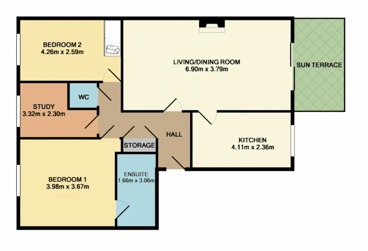 Bedroom 2 4.26m x 2.59m Window to rear, ceiling coving, wash hand basin, built in wardrobes.