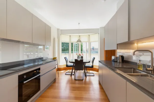 Number 22 is presented in wonderful condition with a walk in “wow” factor, with high quality fixtures and fittings throughout. The apartment comprises: entrance hall, with skylights flooding the hall with light, double doors leading into a large living room that connects through further doors into the spacious fully refurbished modern kitchen/ dining room, all with solid maple wood flooring and opening out on to the large south facing wrap around balcony.