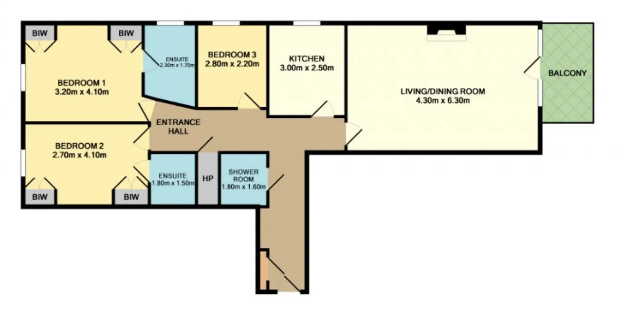 Bedroom 2 2.70m x 4.10m Double bedroom with carpet floor, large window and built in wardrobes.