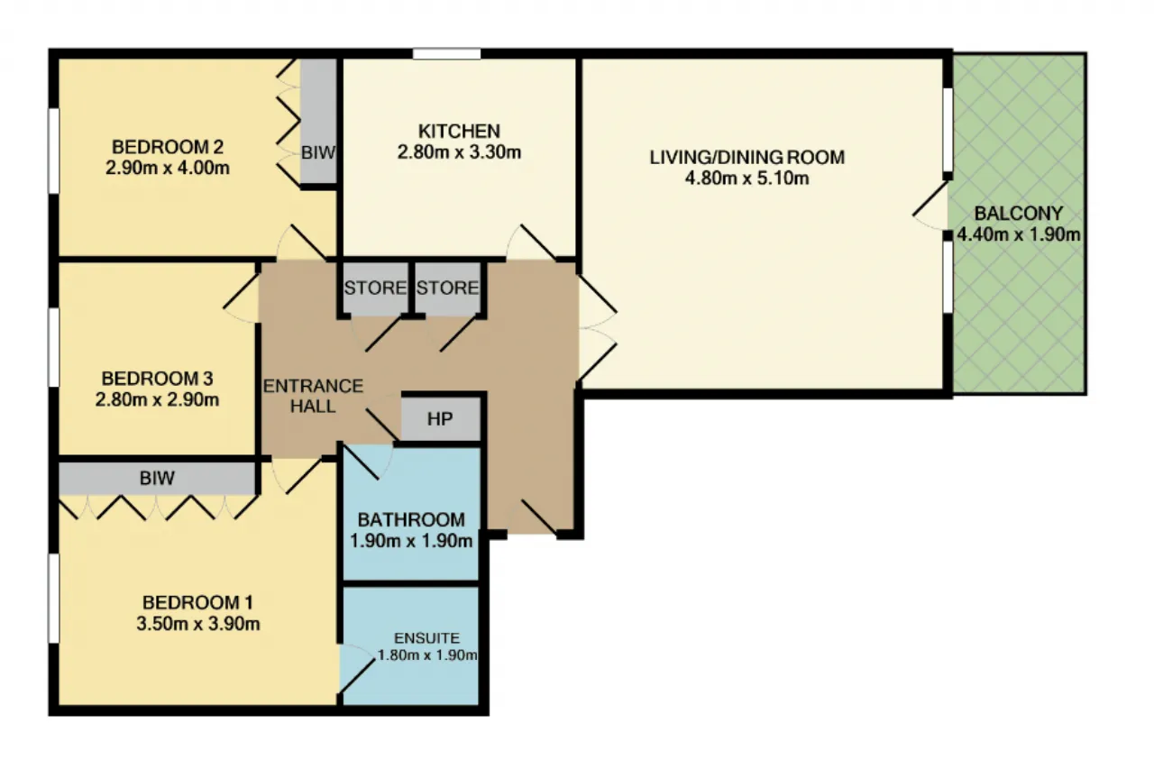 Bedroom 1 3.50m x 3.90m Large main double bedroom with built in wardrobes, carpet flooring and window to front.