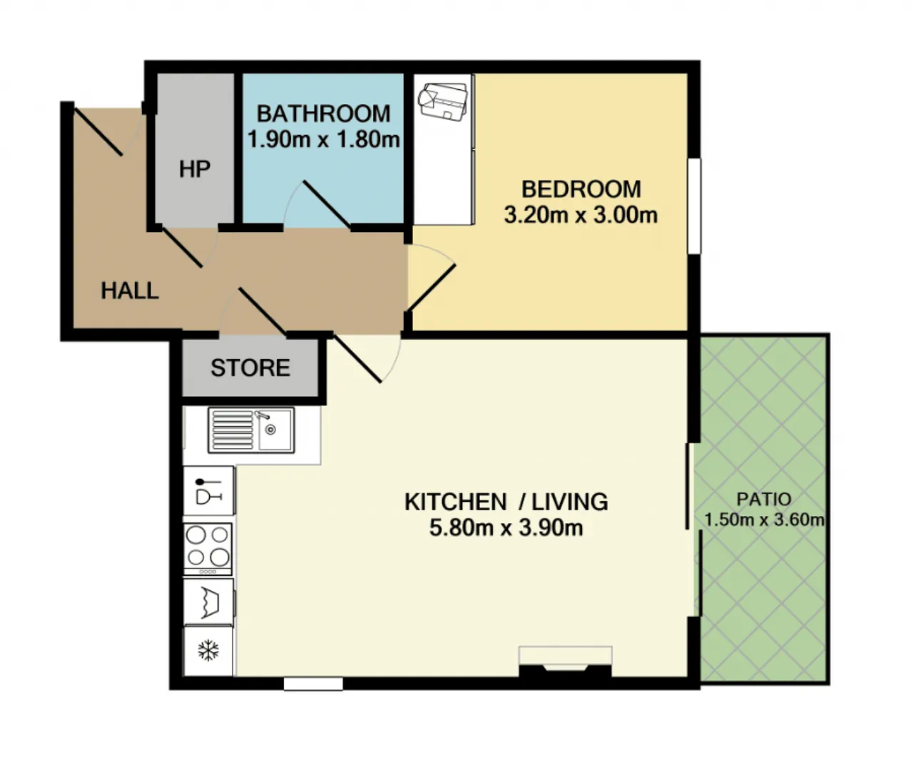 Patio South facing with plenty of space for dining al fresco & boiler house.