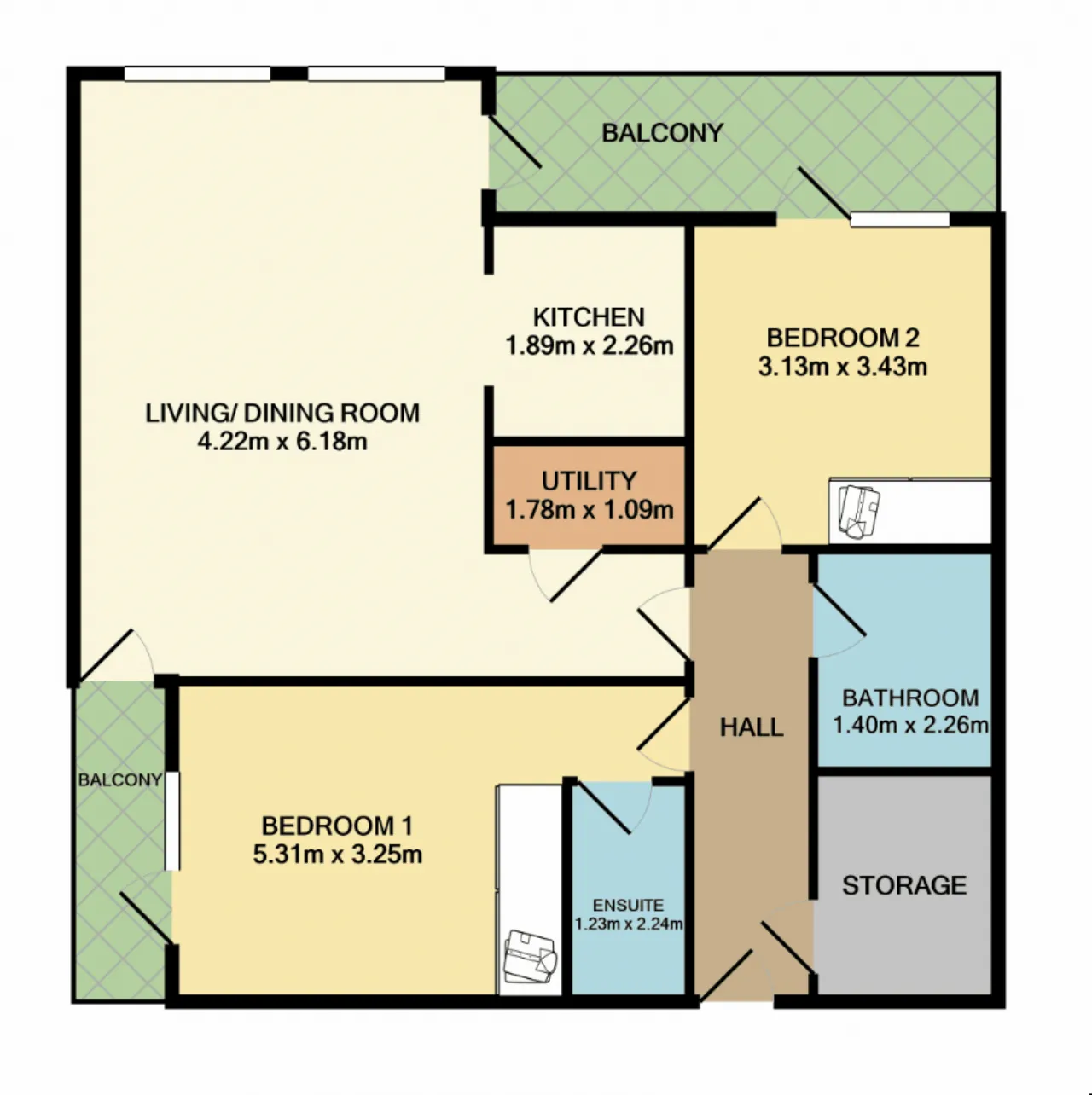 Bedroom 1 5.31m x 3.25m Built in wardrobes, door to balcony, chrome light switches, door to;