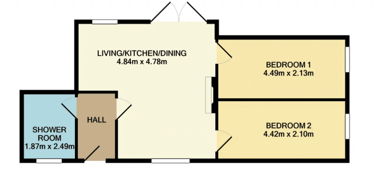 Shower Room 1.87m x 2.49m Tiled wall and floor, wash hand basin, wc and shower unit, chrome heated towel rail, window with privacy glass.