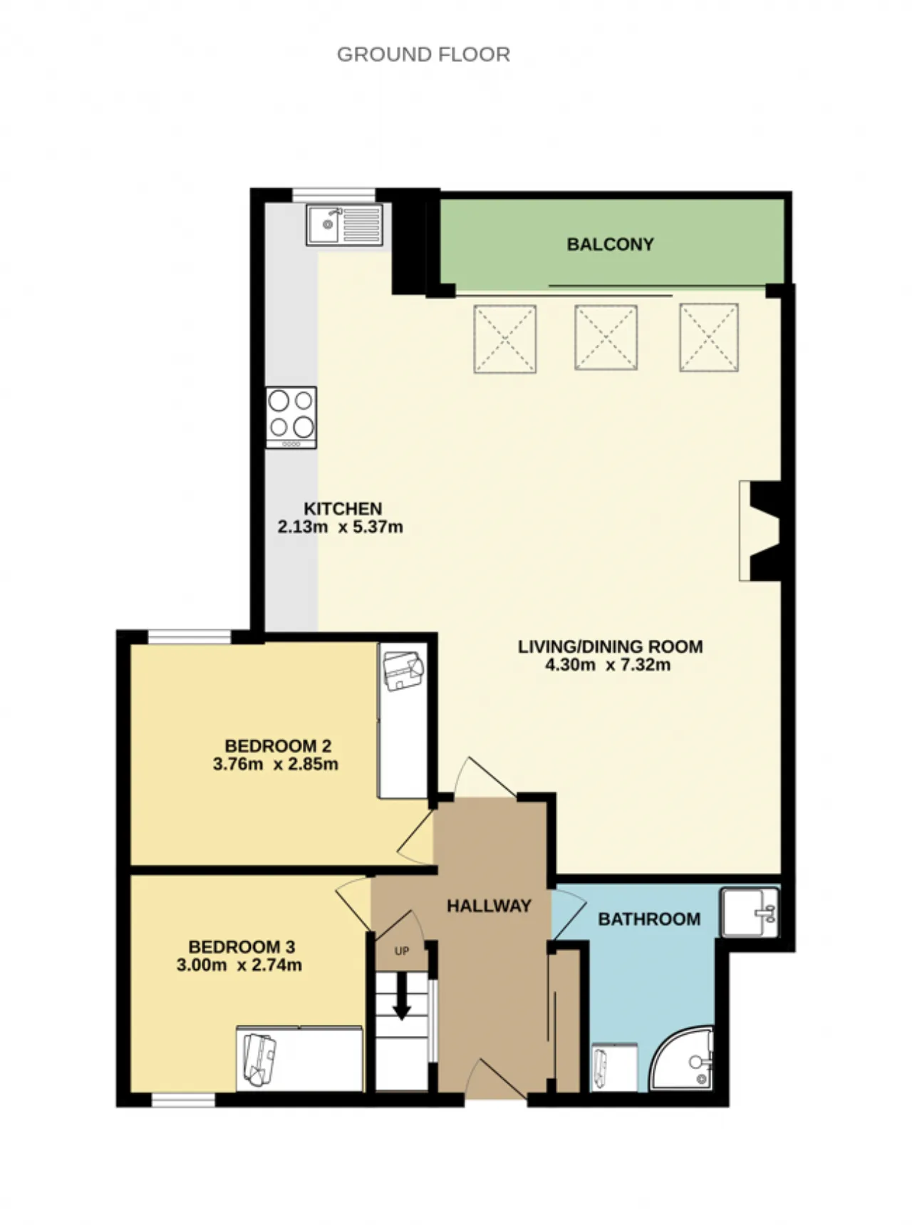 Living/Dining Room An incredibly impressive, open-plan living area with high-quality, laminate timber flooring and stylish light fittings. The owners have put a lot of thought and care into the design of this room, which uniquely benefits from overhead skylights, allowing a wealth of natural light. A new, high-spec sliding door, leads to the wonderfully private balcony, overlooking the well-maintained, communal gardens. An electric fire provides a lovely, homely feature to this spacious room.