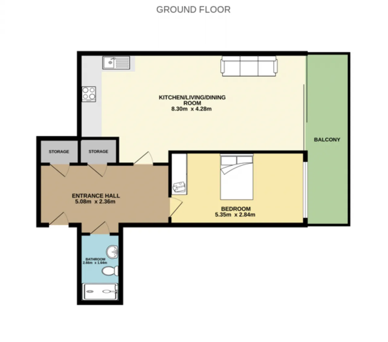 Living/Kitchen/Dining Room 8.30 x 4.28 A spacious living area fitted with light oak-style laminate flooring, large sliding doors leading to a southwest facing private balcony overlooking the communal grounds, provide a wealth of natural light. Open plan to a fully fitted modern kitchen finished with Calacatta quartz countertops. There is a good selection of floor and eye-level presses and integrated appliances including an oven, microwave, hob, extractor fan, and washing machine.