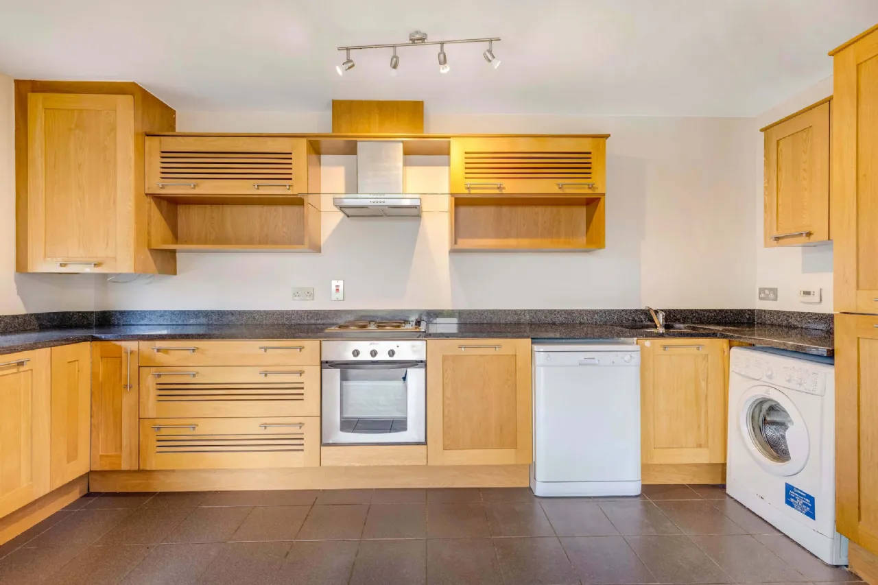 Kitchen 4.83m x 2.00m Ceramic tiled floor, maple shaker style fitted kitchen, natural stone countertops.