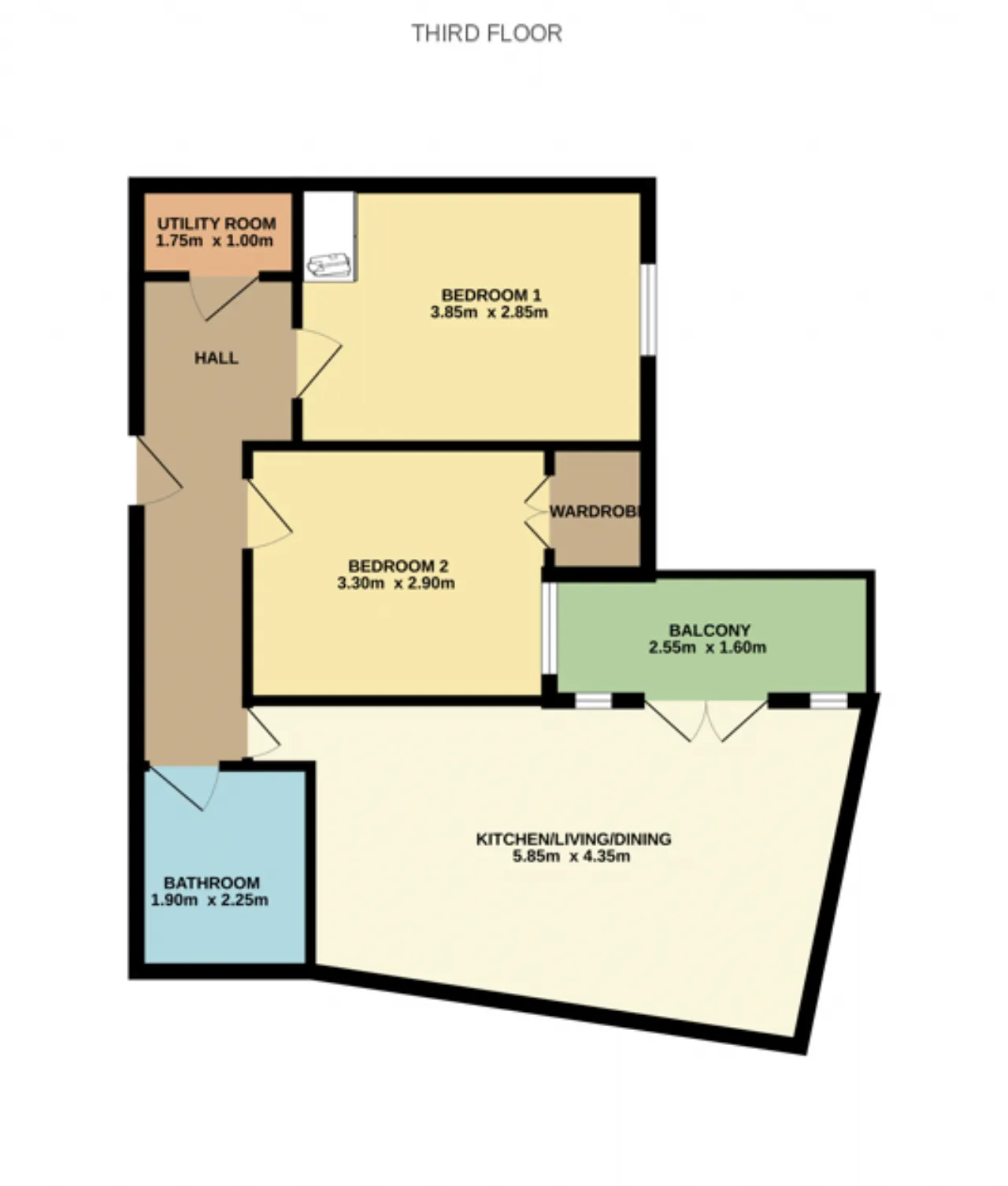 Living/Dining 5.85m x 4.35 Laminated timber effect floor, tv point, Triple glazed French doors out to balcony.