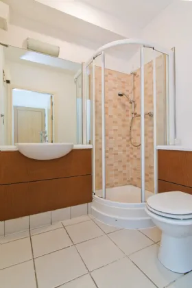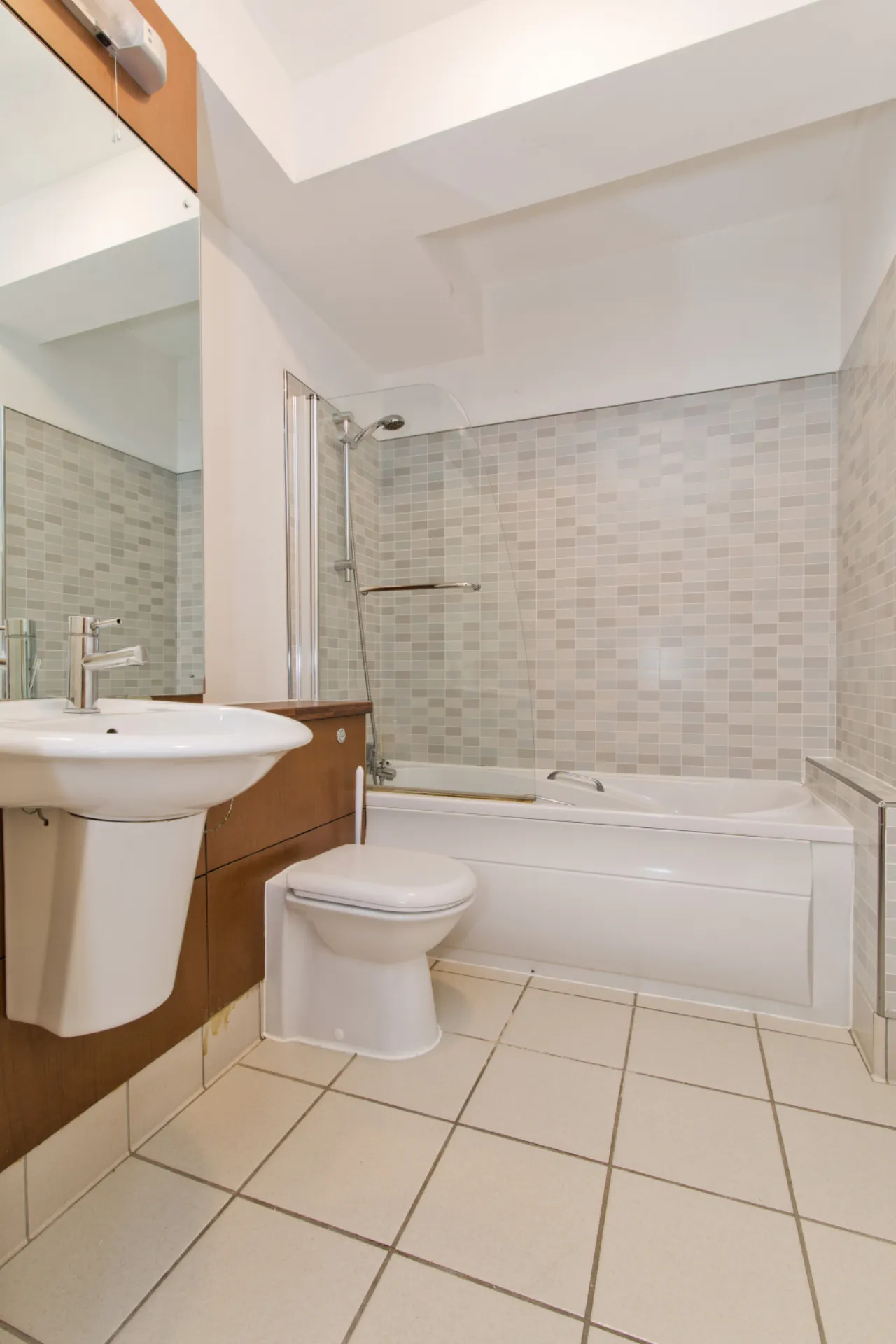 Bathroom 1.796m x 3.179 Tiled main bathroom with, wc, whb, bath and shower, with a large wall-mounted mirror.