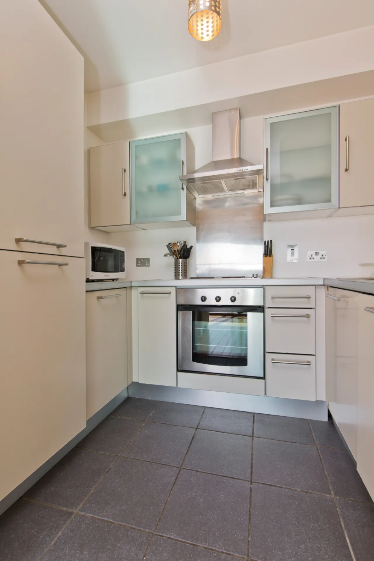 Kitchen 1.805m x 2.494m Well-appointed kitchen off the living/dining room with ample storage in the floor and wall-mounted cupboards, integrated fridge/freezer, oven & hob, plumbed for a dishwasher.