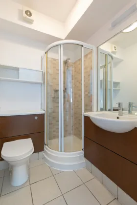 Bathroom 1.802m x 2.404m Tiled main bathroom with, wc, whb, bath and shower, with a large wall-mounted mirror.