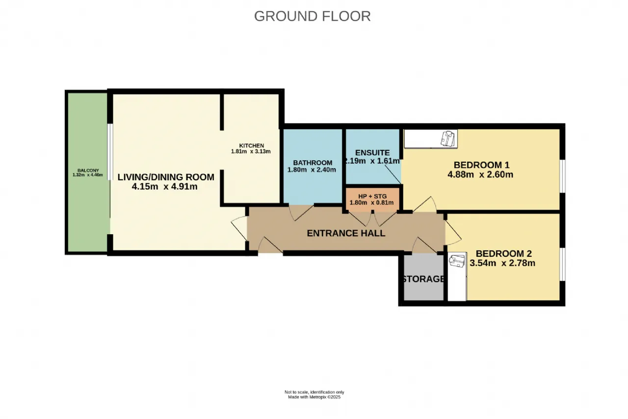 Bedroom 1 4.880m x 2.600m Generous main double bedroom with laminate wood flooring, picture frame window, built-in wardrobes, and ensuite shower room.