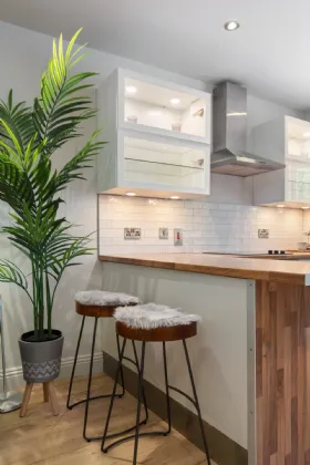 Kitchen Laminate flooring, painted shaker style base units with a wood effect countertop, breakfast bar and integrated appliances (inclusive of a washer/dryer), wall cabinets, tiled splash back and open plan to the living/dining room.
