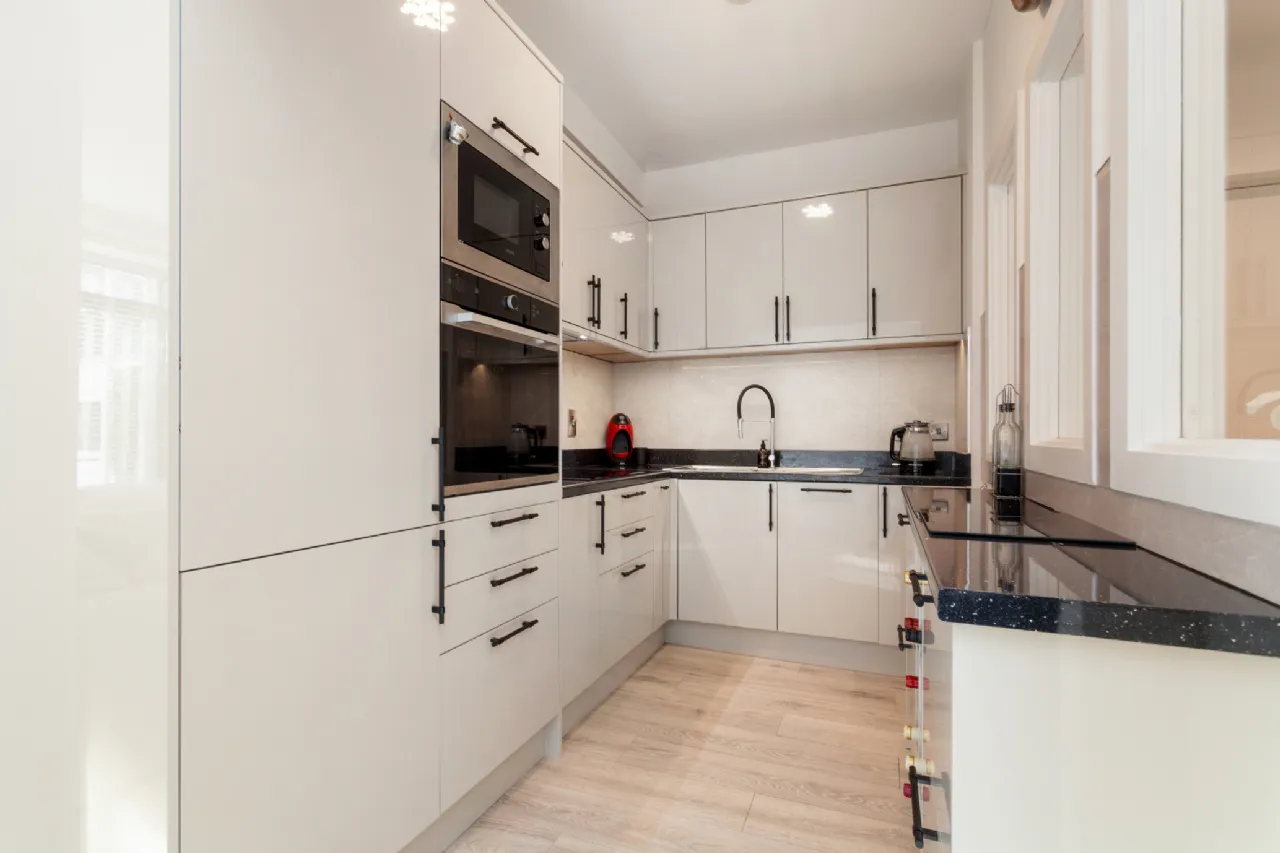 Kitchen 1.971m x 2.779m Impeccibly designed modern U-shaped kitchen with a high gloss finish, contrasting black hardware and granite countertop, complete with ample amounts of storage in the floor and wall-mounted cupboards, integrated fridge/freezer, oven and microwave, electric hob, dishwasher. There are three windows allowing natural light pass through to the entrance hall, while also creating a sense of openness in the room.