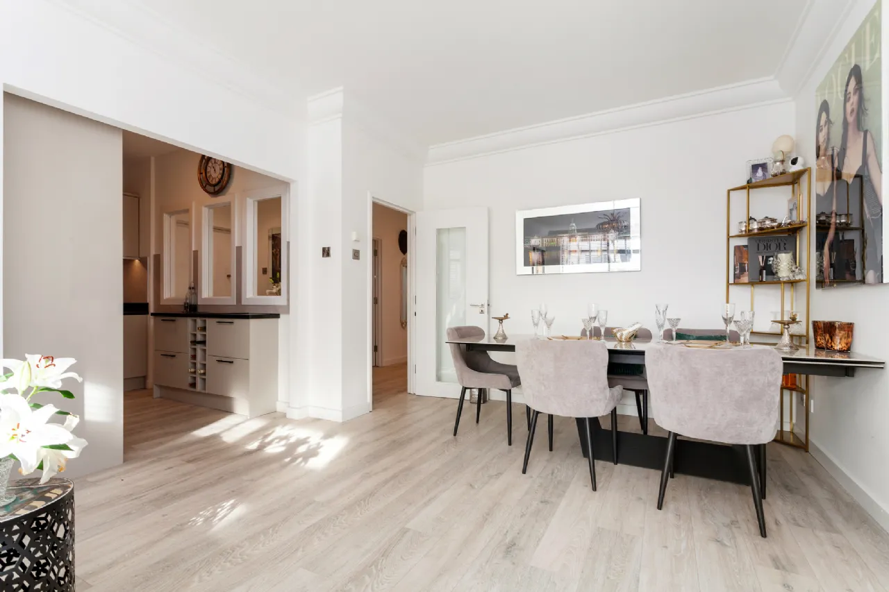 Living/Dining Room 7.166m x 3.753m Warm, bright, south-facing reception rooms of enviable proportions that has been dectorated to the highest of standards by the current owner, with floor-to-ceiling windows that flood the room with natural light and provide access to the private balcony. The kitchen is open-plan off the dining area.