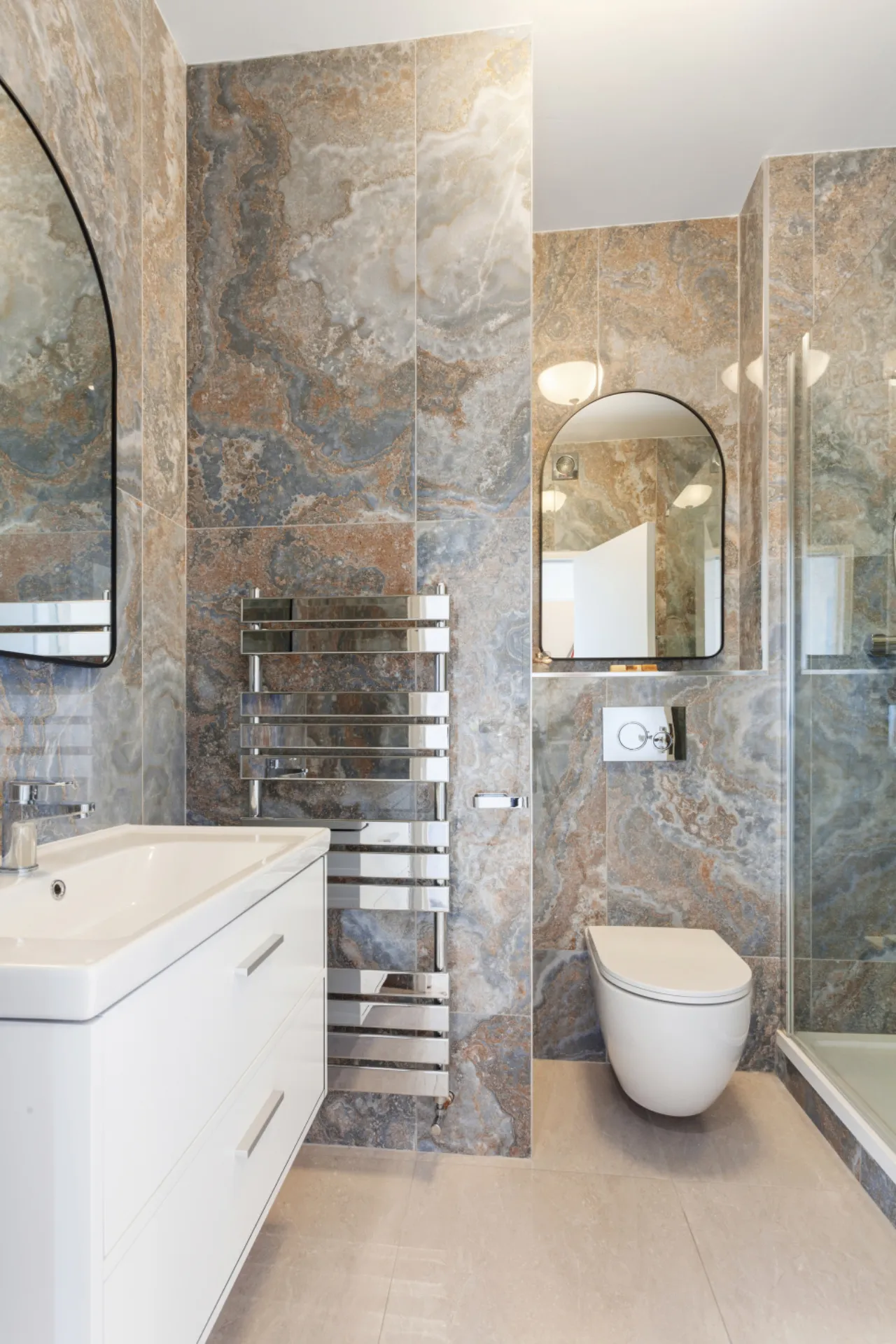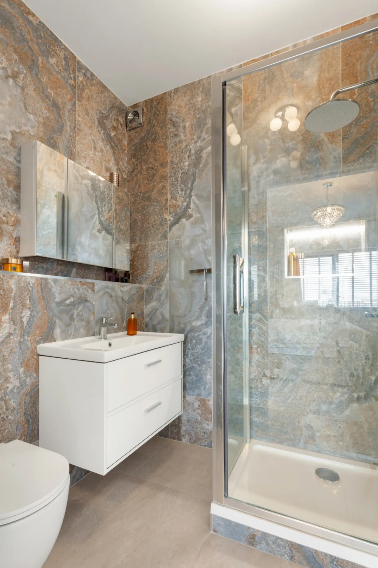 Ensuite 1.694m x 1.843m Beautifully decorated ensuite shower room with a wc, whb and floating vanity storage, a mirrored vanity storage cupboard, a large shower with a rainfall shower head, and a heated towel rail.