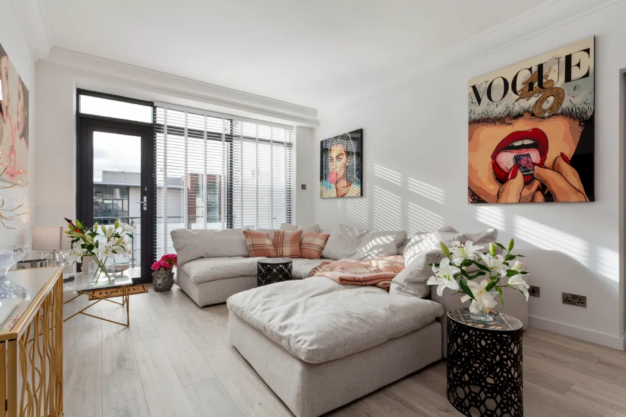 The apartment briefly comprises of a warm, welcoming entrance hall with three windows into the kitchen allowing natural light to flow through the apartment while also creating a wonderful open plan feeling. The living room is of impressive proportions and has been beautifully decorated throughout, with a sunny south-facing aspect and direct access to the private balcony and is open-plan to the stunning modern kitchen. The private south-facing balcony is generously proportioned and provides for a wonderful additional entertaining space in the summer months.