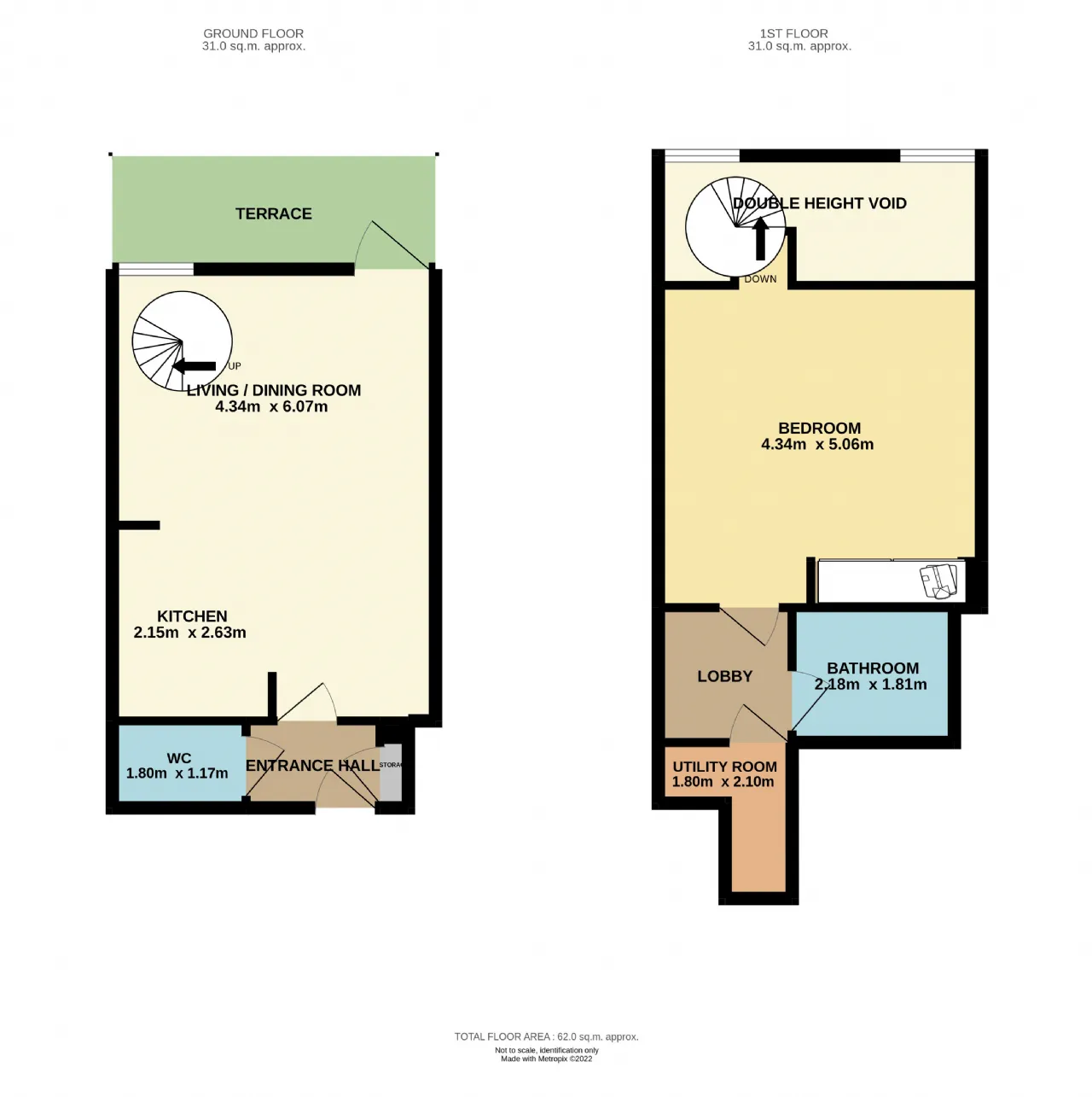 Living/Dining Room 4.343m x 6.083m Bright and spacious open-plan living room with a laminate wooden floor, double-height windows with access to the outdoor terrace, spiral staircase to the mezzanine level.