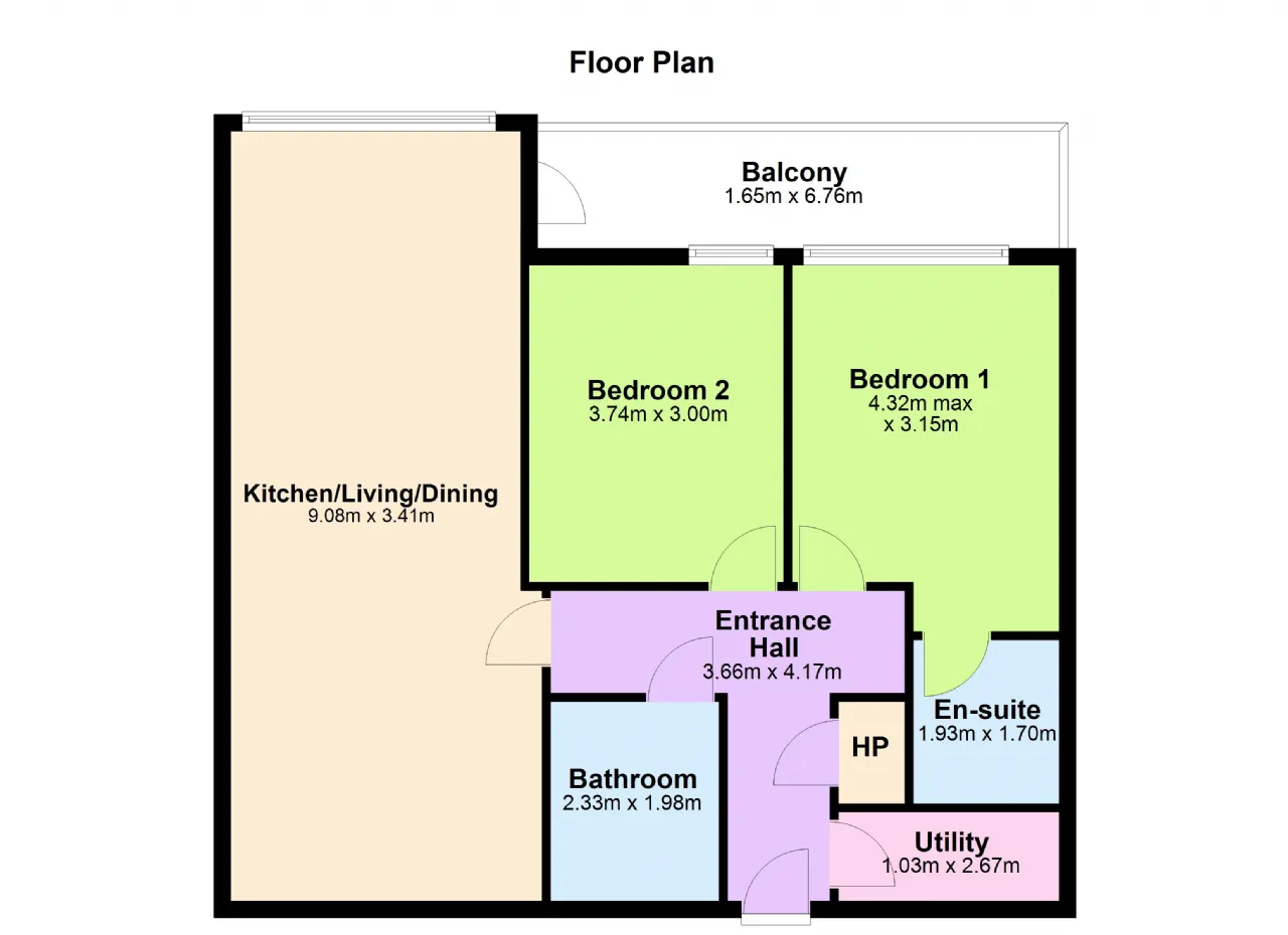Bedroom 1 4.32m x 3.15m Spacious double bedroom, carpet flooring, recessed lighting, built in wardrobe, floor-to-ceiling window, door leading onto balcony.