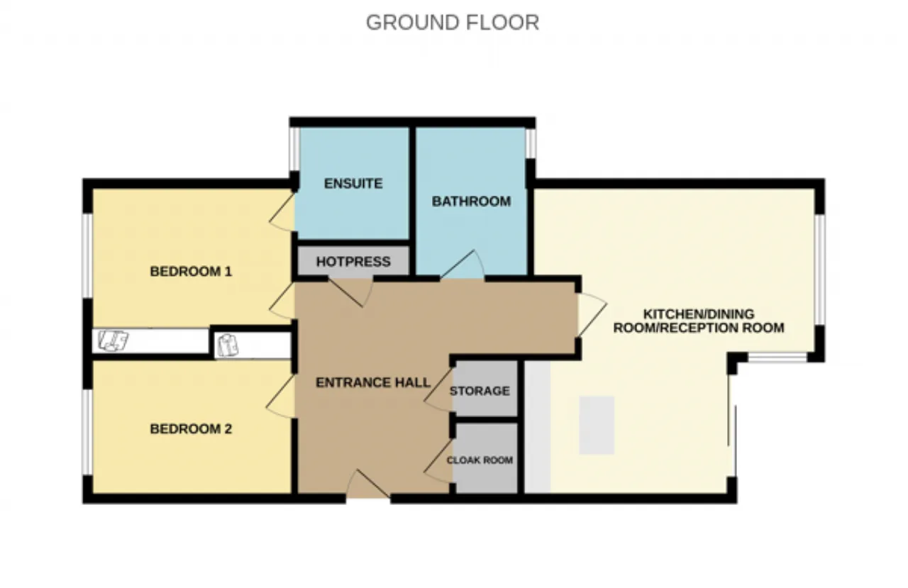 No. 2 Ivy Court is a superb ground floor apartment comprising two generous double bedrooms and a thoughtfully designed layout that maximises space and natural light. The welcoming entrance hall opens into a bright open-plan living and dining area, where sliding doors lead directly to a spacious green area. A modern, fully fitted kitchen is seamlessly integrated into this space, making it both functional and stylish. The main bedroom features fitted wardrobes and a private ensuite, while the second bedroom also includes fitted storage. A large family bathroom completes the accommodation.