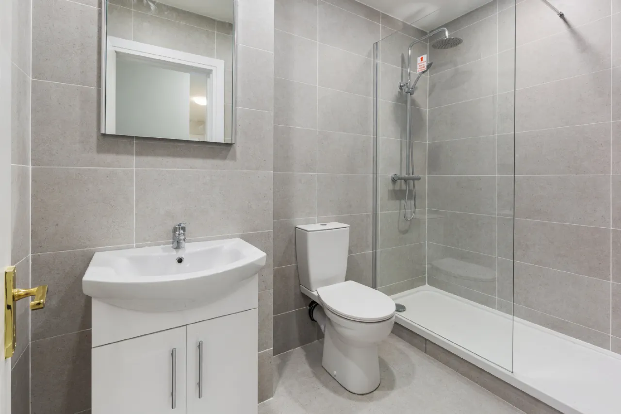 Bathroom 1.577m 2.563m Modern bathroom with tiled flooring, electric shower, whb and wc.