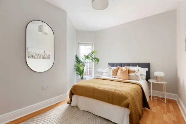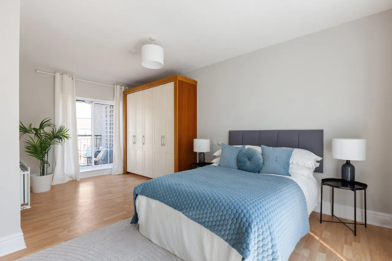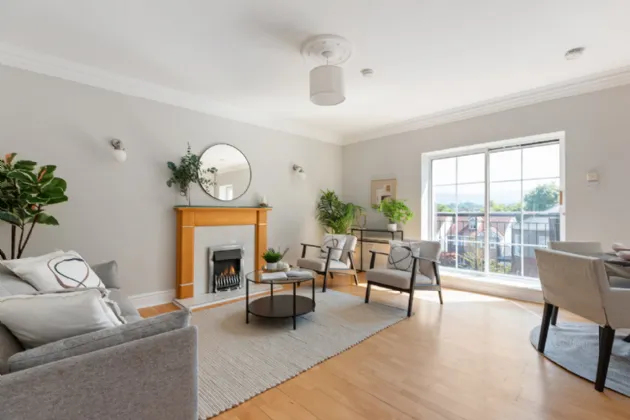 Living Room/ Dining Room/KItchen 7.02m x 4.98m This beautifully designed open-plan space features a timber floor, decorative coving, and a centre rose. A stylish fireplace with an electric fire adds warmth and character. Large sliding doors open onto a south-facing balcony, offering breathtaking, uninterrupted views of the Dublin Mountains and the beautifully landscaped communal grounds, complete with a tranquil water feature. The soothing sound of flowing water enhances the peaceful ambiance. The kitchen is well-appointed with floor and eye-level units, an integrated washing machine, dishwasher, fridge-freezer, built-in oven, hob, and extractor fan. Double doors open to a generous pantry cupboard. An additional door from the kitchen also leads directly to the balcony. Planning permission has been granted for an extra window in the living area to further maximise the stunning mountain views.