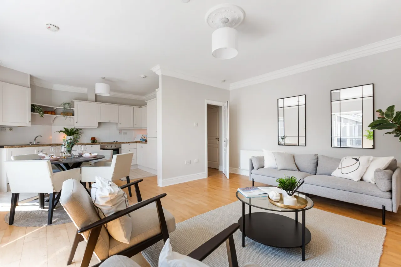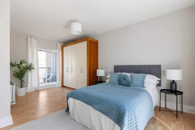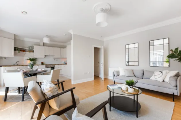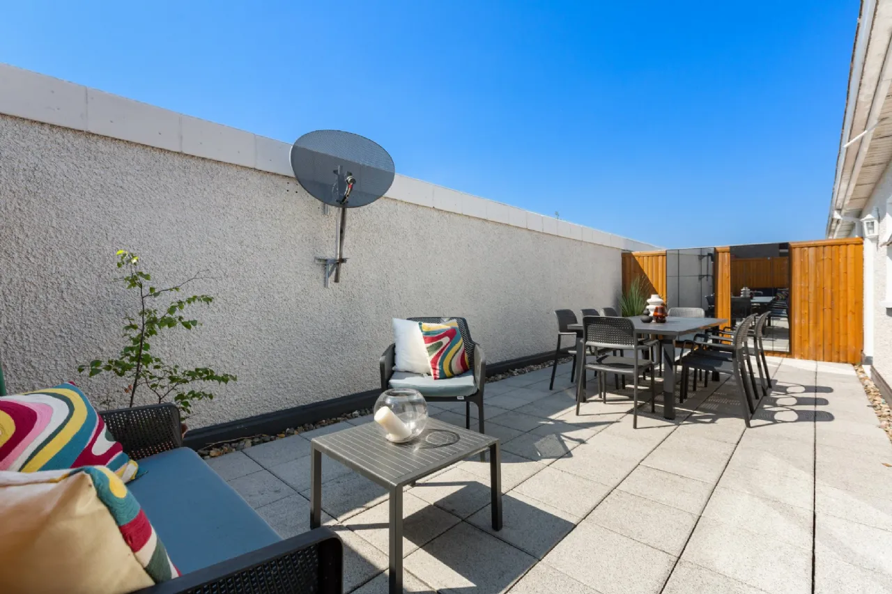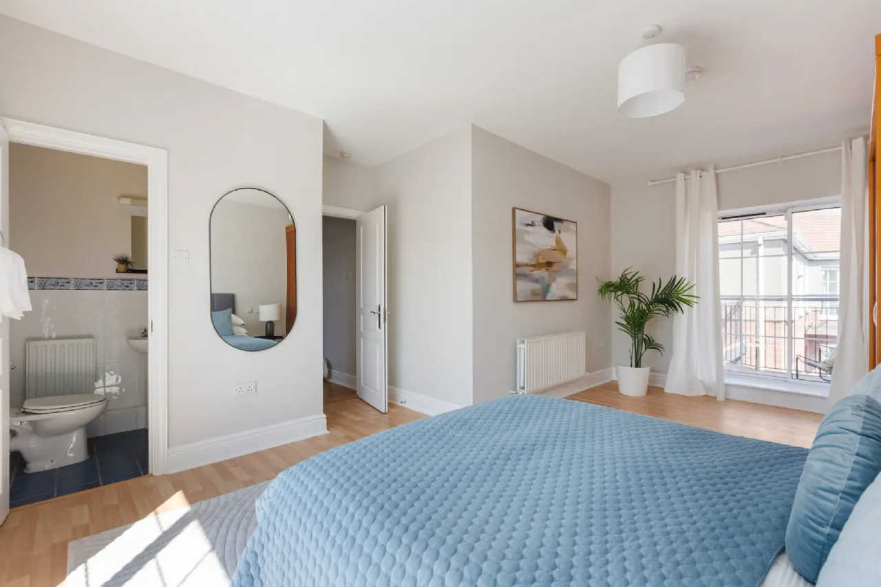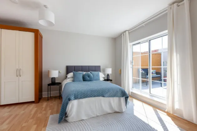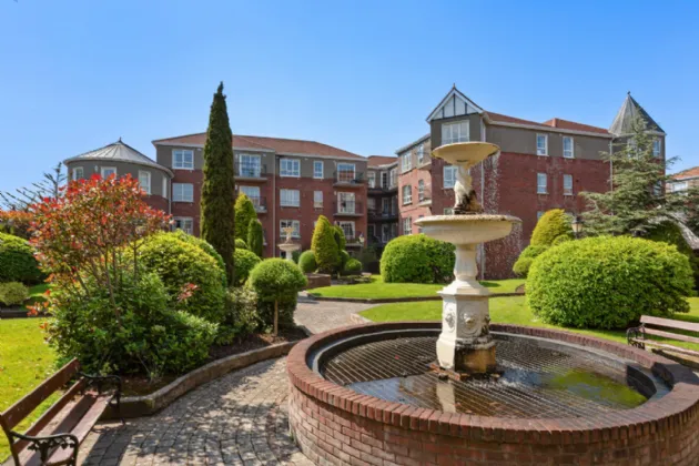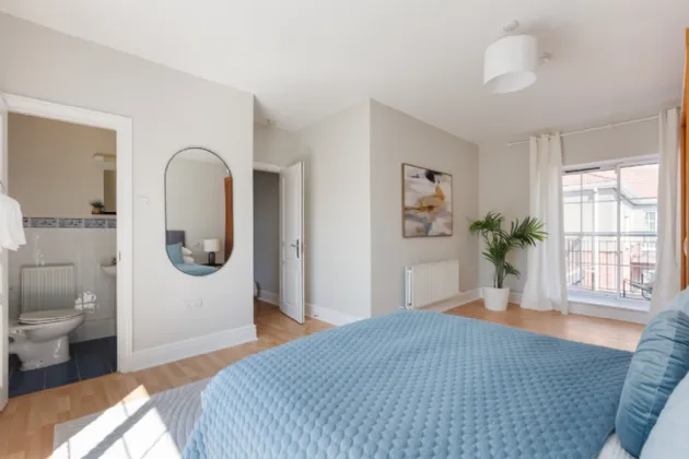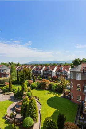 From the moment you step inside, you're met with a sense of space and elegance. The apartment is flooded with natural light and finished in a modern, contemporary style that perfectly complements its serene surroundings. One of its most impressive features is the large south-facing balcony, accessible from every room, overlooking the beautifully manicured communal gardens and also the private courtyard offering privacy, seclusion and fabulous outdoor space that you don’t usually find with apartments. The view is truly breathtaking — uninterrupted vistas across the Dublin Mountains, framed by lush greenery and enhanced by the gentle sound of a flowing water feature below, creating an atmosphere of complete calm.