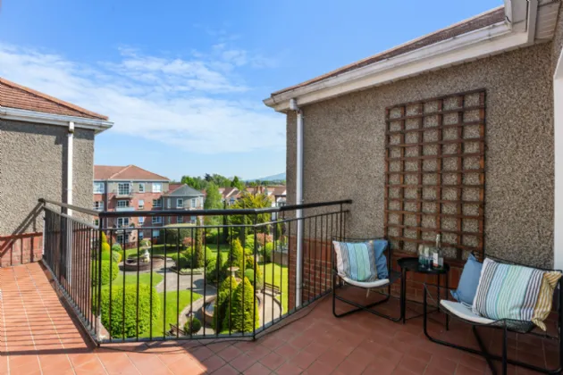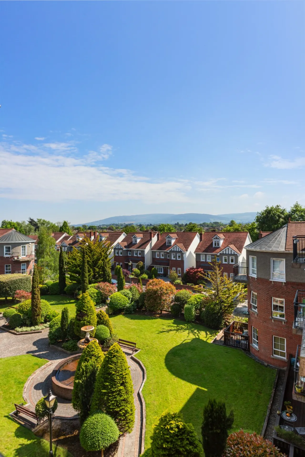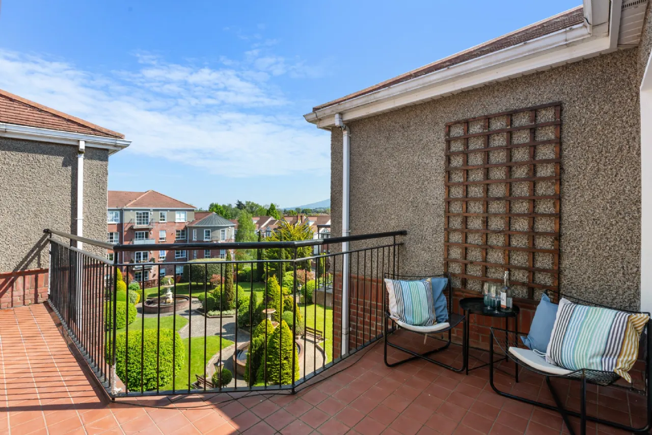 Balcoony The south-facing balcony features terracotta tiled flooring and enjoys stunning views over the lush landscaped gardens and water feature, with panoramic vistas of the Dublin Mountains beyond.