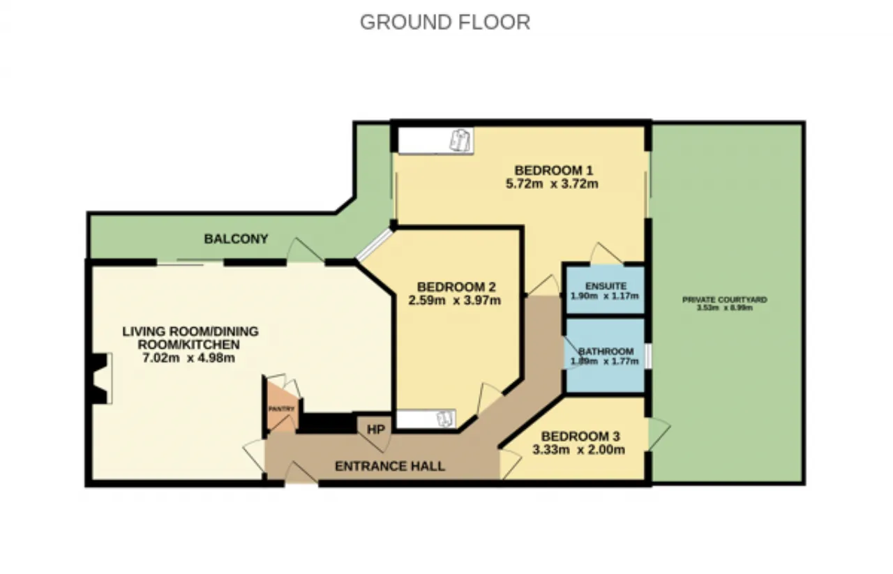 Bedroom 2 2.59m x 3.97m Another generous double bedroom with built-in wardrobes and access to the balcony.