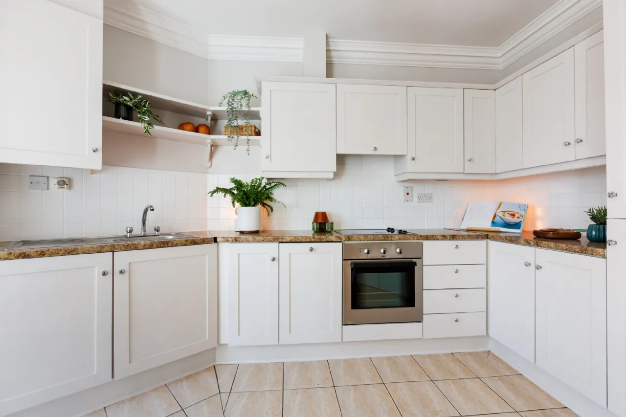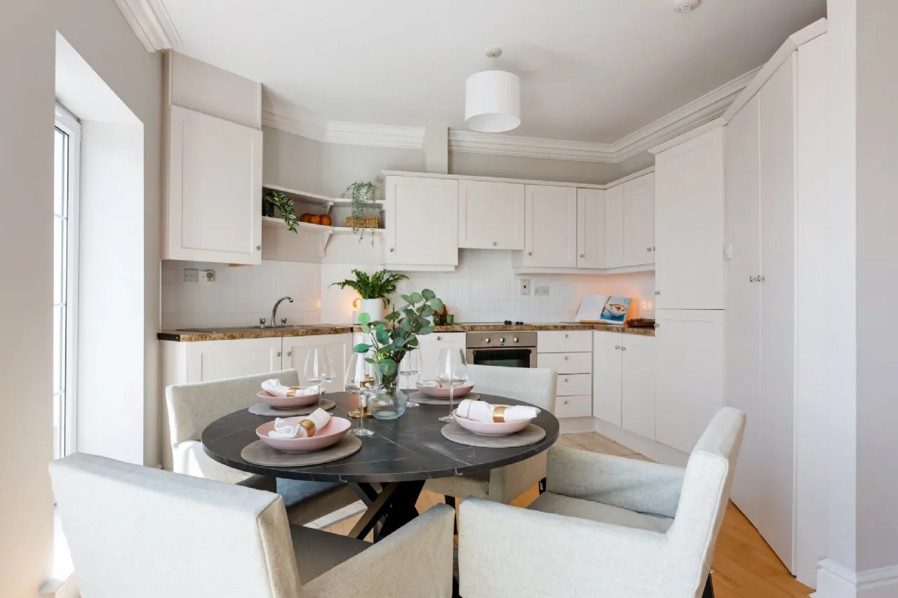 The generous open-plan living, dining, and kitchen area is designed for both relaxation and entertaining, with large sliding doors opening out onto the balcony and allowing the stunning scenery to become a part of daily life. The kitchen is fully fitted with high-quality appliances and thoughtful storage, seamlessly integrated into the stylish layout.