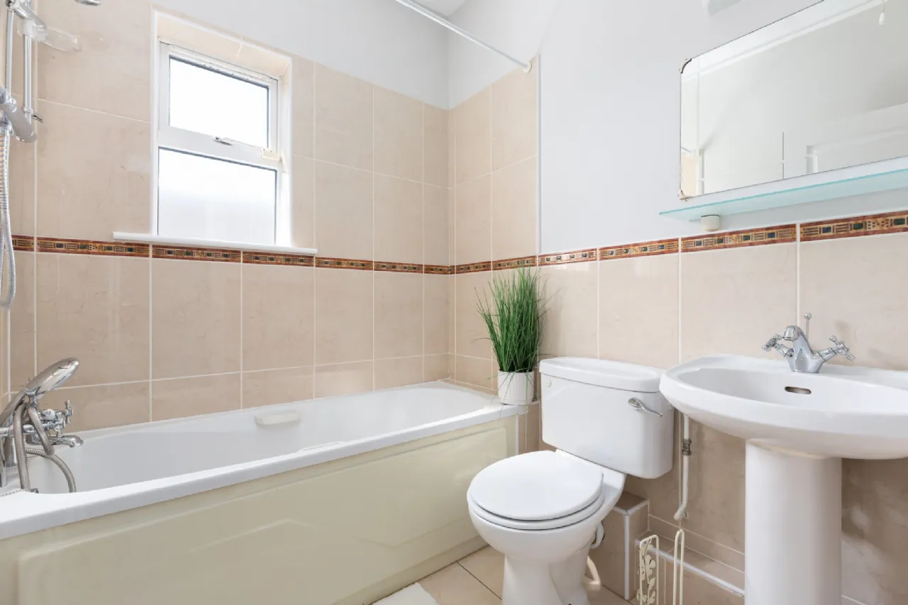 Bathroom 1.90m x 2.77m Finished with tiled walls and floors, and equipped with a WC, wash hand basin, and a bath with overhead shower.