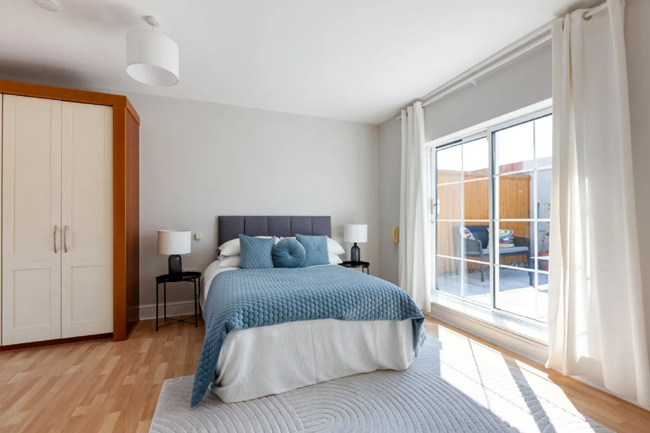 Bedroom 1 5.72m x 3.72m A spacious double bedroom with dual aspect, featuring sliding patio doors on one side opening to the balcony, and on the other to a private terrace. Built-in wardrobes provide ample storage. The room also benefits from a stylish ensuite.