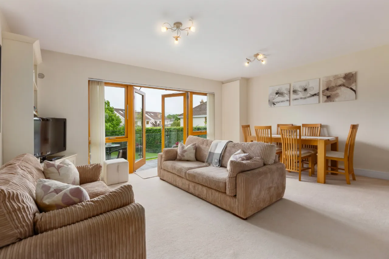 Living Room/Dining Room Spacious room with carpet flooring, bespoke cabinetry and balcony with view over the communal grounds and Dublin Mountains.