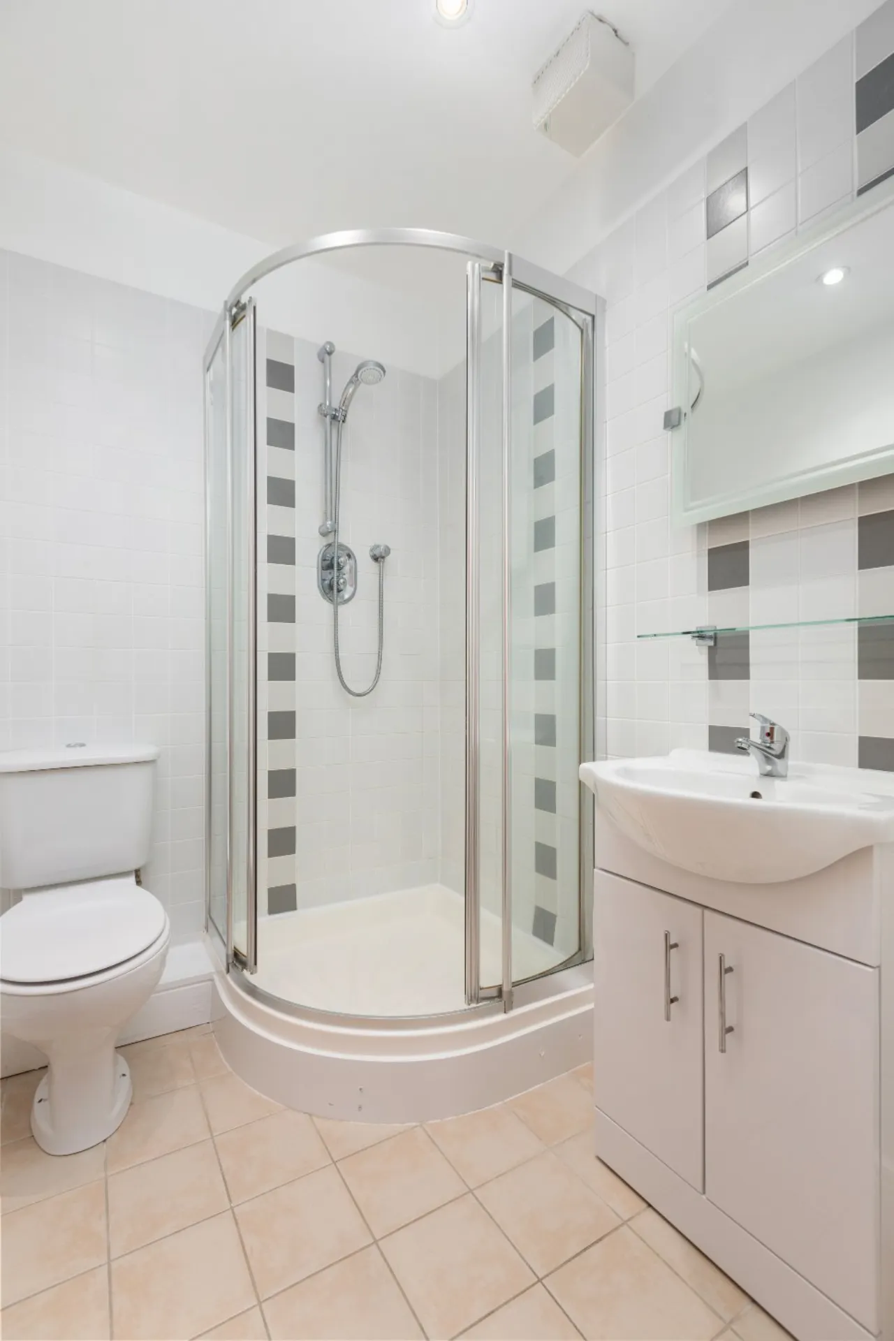 En-Suite Fully tiled en-suite, shower cubicle with glass surround, w.c., and wash hand basin with under-sink storage.