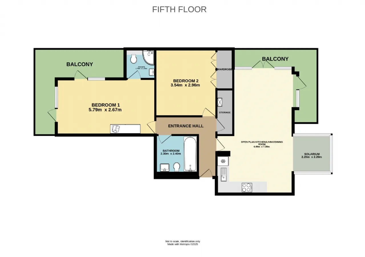 Bedroom1 5.79m x 2.67m Elegantly appointed double bedroom with its own private walled balcony, dual aspect windows to the front & side aspect, built in wardrobes, carpeted floor coverings and opening to the en-suite bathroom
