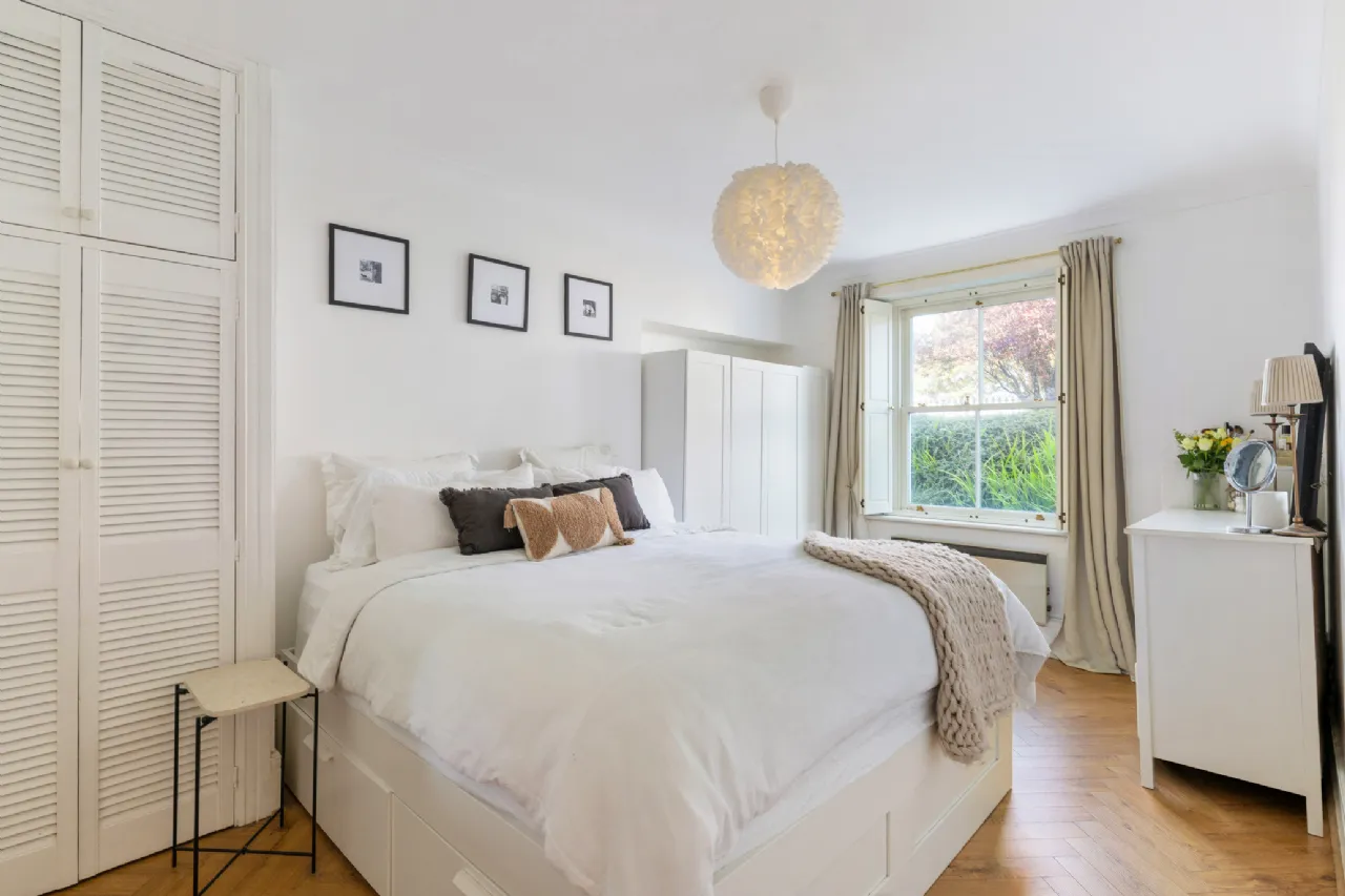 Bedroom: Large double bedroom with herringbone wood flooring and built in wardrobes.
