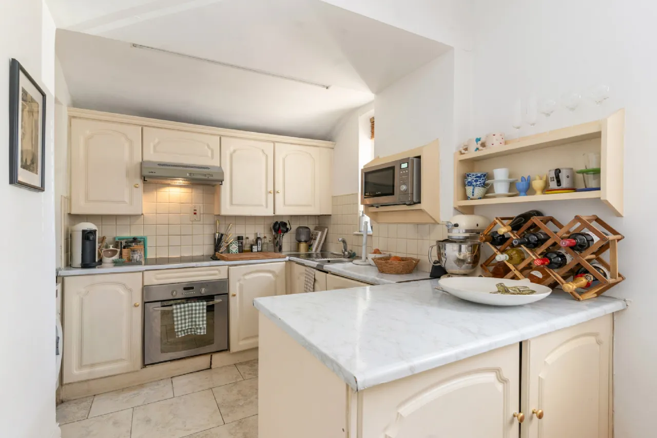 Kitchen: Well equipped kitchen with tiled floor, wooden floor/ wall cabinets, laminate countertop, tiled splashback, integrated electric hob, oven, extractor fan and dishwasher.